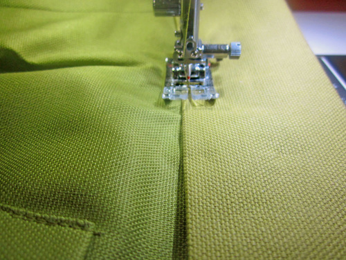 - Edgestitch the pocket in place along the sides and across the bottom, pivoting at the corners. This seam seals the opening used for turning.