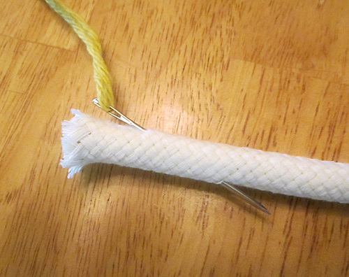 - Thread the end of the yarn through the yard needle, but keep it on the cone. Start approximately ¾” from the end of one length of cording.