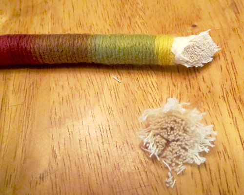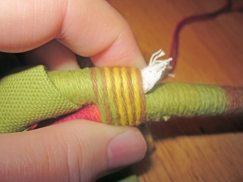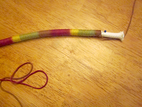 - Wrap the yarn around the cord smoothly and evenly. Go slowly in order to keep your wrap as even as possible. You want the strands tight against one another. Stop your wrap approximately ¾” from the opposite end.