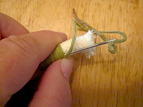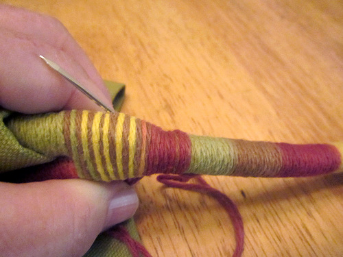 - Secure the yarn by sending the needle back through the wrap. Pull taut and trim the excess close to the handle.