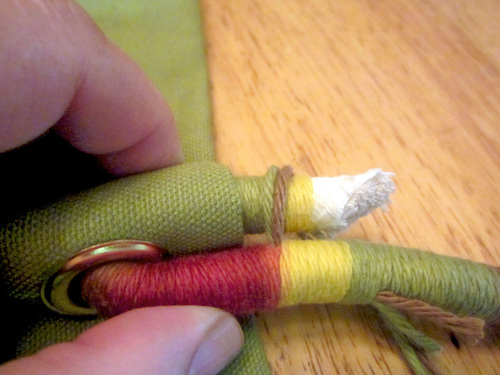- Secure the ends by inserting the yarn needle back through the end of the wrap, pulling the ends through approximately 1” back from your end point. Cut the ends free from the cone so they extend about ¾” from the wrapped handle.
