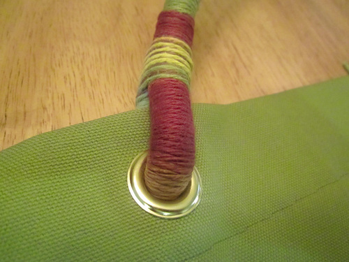 - Insert one end through a grommet on one side of the tote. You are inserting from front to back. Bring the handle through far enough so the angled end sits against the yarn-wrapped portion of the handle as shown in the photo below. In this photo, you can also see those original cut ends extending from the handle. You can trim these ends flush once the cut end is anchored.