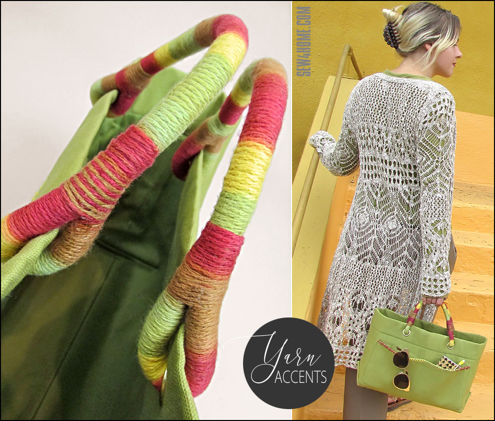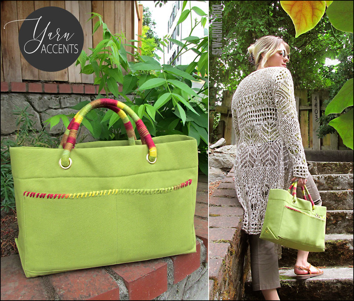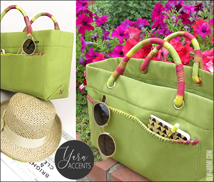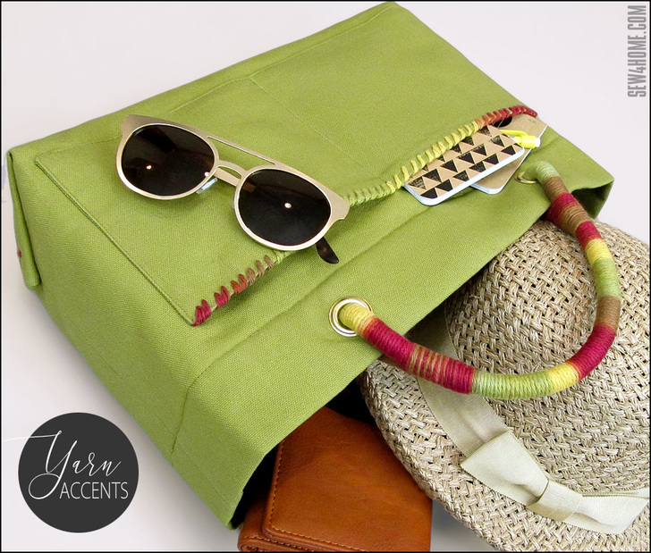 Often, the best way to showcase an interesting embellishment is to keep your fabric muted so the featured technique shines. We used a variegated cotton yarn to create custom wrapped handles on this classic box tote – then added yarn whip stitching along the pocket top and an eye-catching crosshatch to hold the unique reverse box corners in place. Dimension, color, and style all in one.