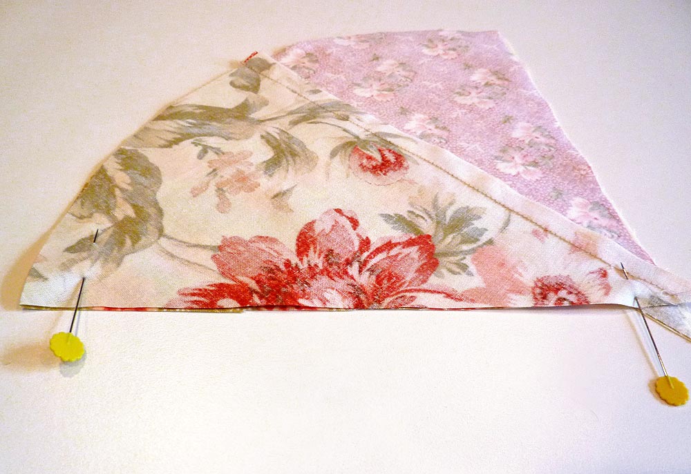 - Select the second pair of wedges from your first set of four. Place them right sides together. Pin along one side.