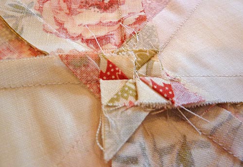 - Cover buttons with coordinating fabric scraps; we used the leftover fabric from cutting out the wedges, fussy cutting to center a pretty design. Also, we always add a small scrap of lightweight batting under our fabric for a smooth, curved shape to our covered buttons.