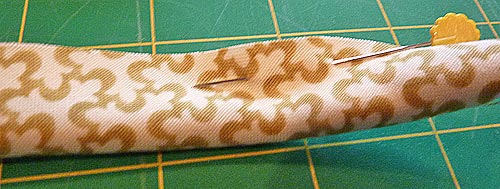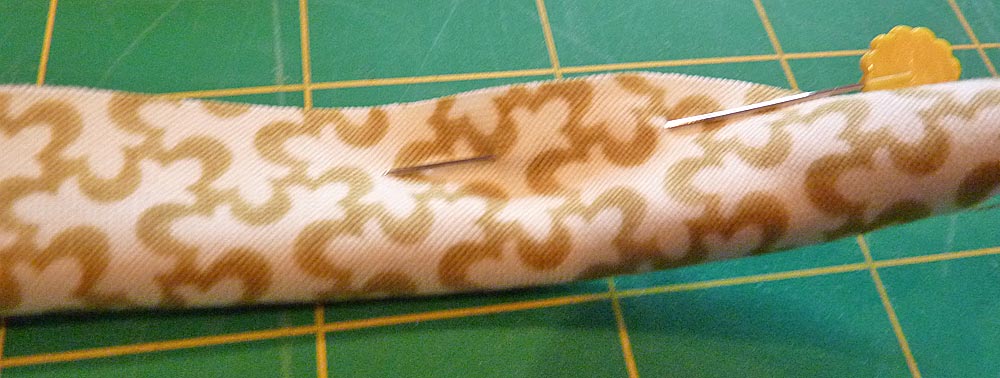 - Wrap the fabric around the cord, right sides facing out. Pin close to the cording to hold it in place.