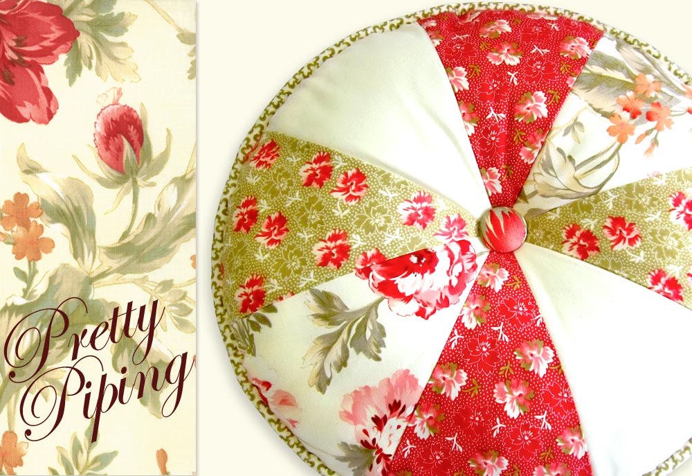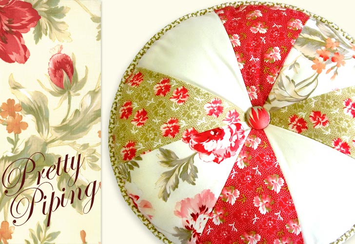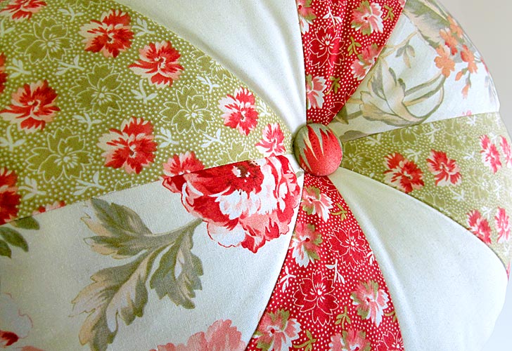 This lovely round pillow allows you to practice a number of techniques that will come in handy on many future projects. There’s custom piping, a covered button that creates a tufted center point, and patchwork wedges that come together to form a perfect circle. We offer a free downloadable wedge pattern below.
