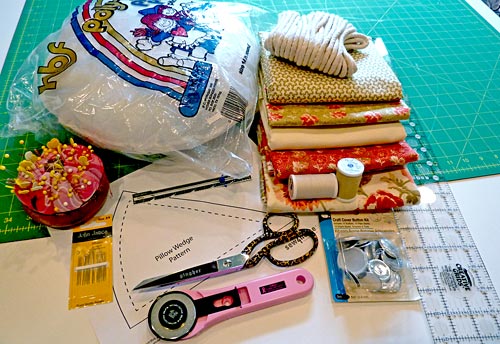 NOTE: With ¼ yard you will need to cut several strips on the bias; if you can afford a bit more (and perhaps are thinking about making more than one pillow), get ½ yard and you’ll be able to cut longer, and therefore fewer, strips. - Small scrap of lightweight batting for the covered buttons
