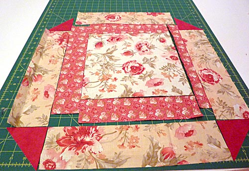 NOTE: We cut two 3½” x width of fabric strips and ten cut those strips down into the 14″ lengths. - From the fabric for the corner triangles (Solid Ruby in our sample), cut TWO 3½’ x 3½” squares, then cut each square in half into two triangles