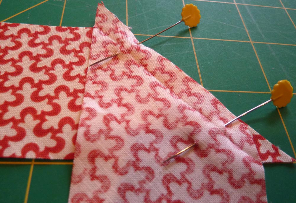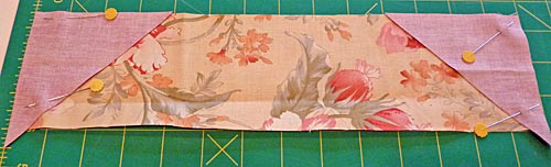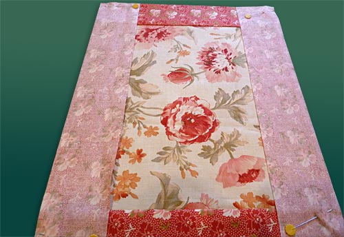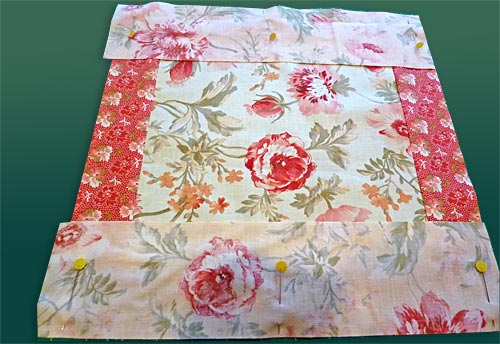- Pin one strip, right sides together, on each side of the center square.