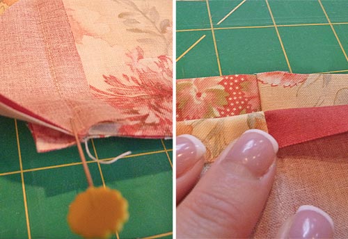NOTE: Since you cut your strips on the bias, it should bend nicely, but you can also cut a few slits into the flange to help it around the corner angles. However, be sure not to cut into your stitching. - To join, cut back the piping cord to match and overlap to finish.