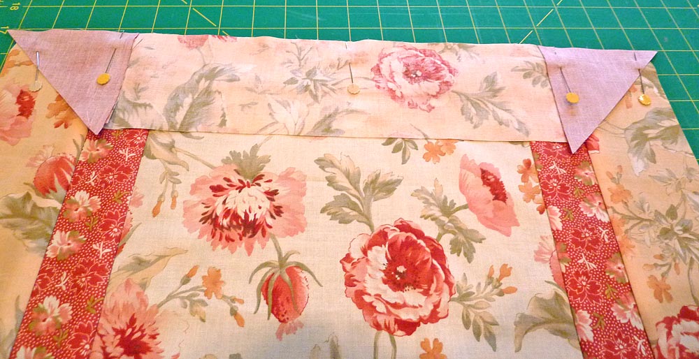 - Find the four small triangles. Pin one triangle, right sides together, to each end of the two remaining 14″ outside frame strips.