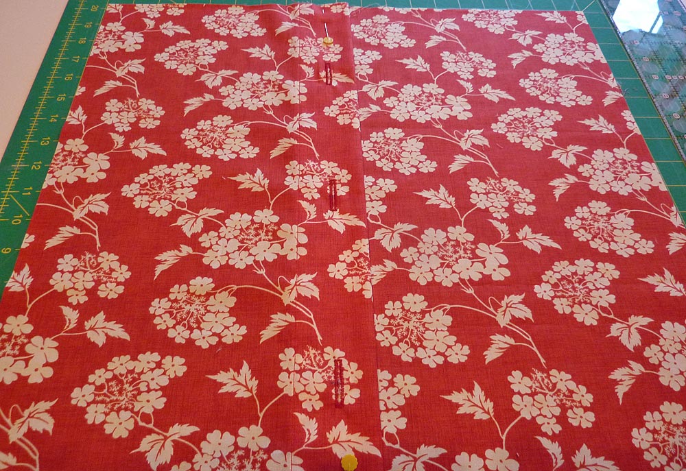 NOTE: If you are new to hemming, check out our technique tutorial: How To Make A Simple Hem. - On the hemmed overlap panel mark placement for the buttonholes. One buttonhole should be at the exact center (9″ from the top/bottom).The other two buttonholes should each be placed 5″ from each raw edge (5″ down from the top and 5″ up from the bottom).