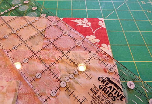 - Align your see-through ruler along the raw edge of the corner triangle. Use a rotary cutter to trim off the corner of the pillow back so it is flush with the pillow front.