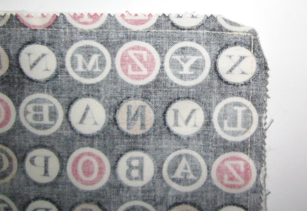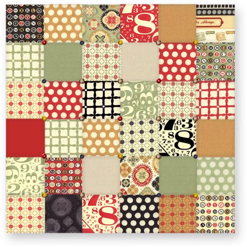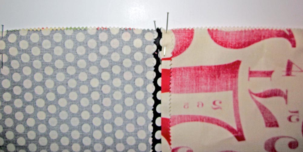 - Starting with the six squares in the first patterned row, pin the squares together into three pairs: one and two, three and four, five and six. Each of the pairs should be placed right sides together and pinned along one side. Keep track of any directional prints to make sure everything is going the right way. Our Circa 1934 collection had number and letter motifs, which we needed to keep careful track of.