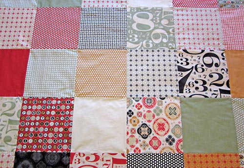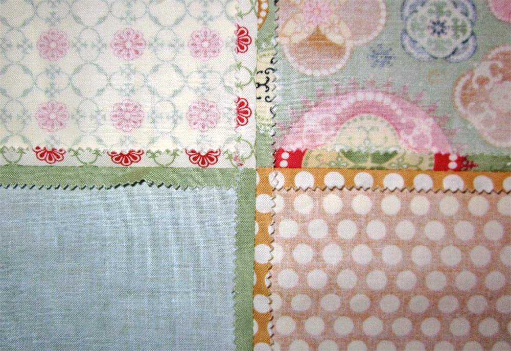 You could also fussy cut 10″ x 10″ squares from larger fabric scraps, centering a cute motif within each square.
