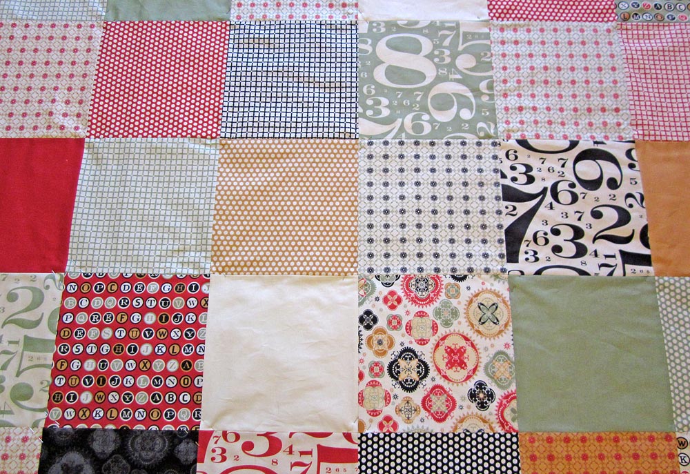 - Decide which 10″ x 10″ patterned squares you want where on the FRONT of the throw BEFORE you begin to sew. Do this by laying them out on a flat surface. We’ve found it’s easiest to use the floor to do this; make sure it’s clean. Mix and match until you have a layout you find pleasing. Remember, you have 36 squares to work with on this side. It’s best to avoid placing similar colors side by side and it looks better when you alternate small and large motifs. You can follow a pattern similar to ours or design your own. There’s no ‘wrong’ design; it’s all based on what you like best.