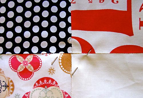 NOTE: If you opted to press your seam allowances in certain directions as described above, they can now be “nested” together. With one seam allowance pressed in one direction and the opposing seam pressed in the opposite direction, they lay easily against each other. This will help you to line up the corners so you get super sharp intersections on the front, called ‘perfect points’ in quilting.
