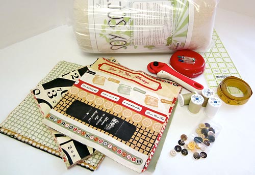 NOTE: Batting comes in a multitude of sizes and shapes. We had a queen size roll (90″ x 108″) from which we cut our 58″ square, leaving a nice remnant for another project. You could also buy a 60″ wide piece off the bolt or a smaller packaged size. - All purpose color coordinating thread: we used natural