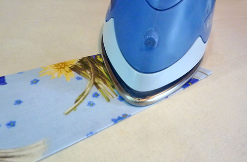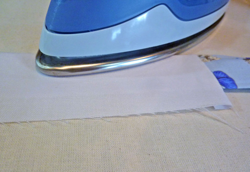 - On the the remaining plain strip, fold up one 20″ edge ½” and press in place.