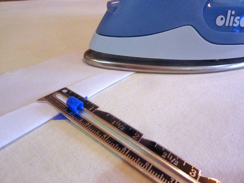 - Fold a fabric strip in half, wrong sides together, and press to set a center crease. Unfold wrong side up so the crease line is visible.