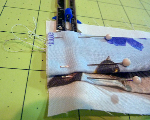 - Find the two 11″ x 32″ pocket panels. Place them right sides together. If you are using a directional print as we did, make sure the directions match so the motif will be right side up on both the front and back when sewn and turned.