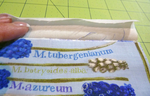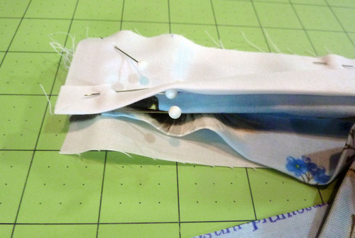 - Slip this binding over the top raw edges of the pocket panels. Slide the pocket panels all the way into the binding so their raw edges butt up against the center crease of the binding.