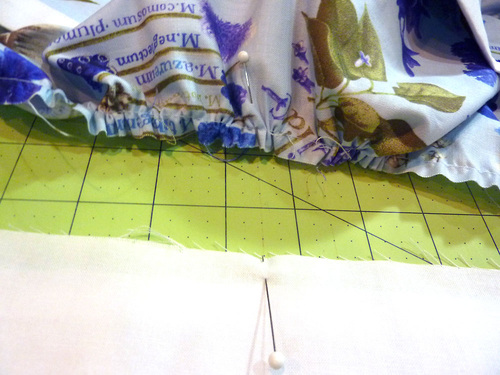 - Using a ½” seam allowance, sew across the width of the skirt through both layers. Sew with the gathered skirt layer on top so you can see the gathers and make sure they stay even as you sew.