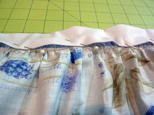 - Pin the raw edge of the waistband, right sides together, to the gathered top raw edge of the skirt, matching the center pin points on both pieces.