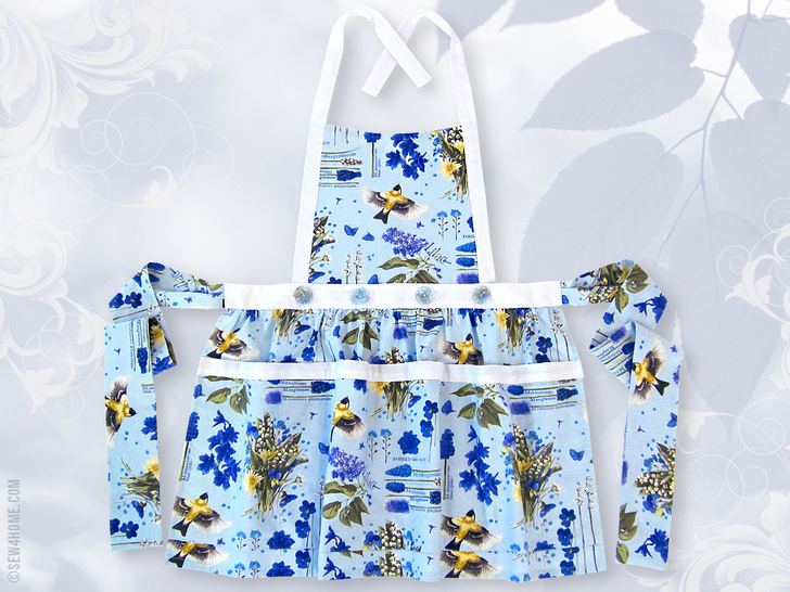 As with store-bought aprons, our design is meant to be one-size-fits-all. However, we realize you may still wish to make yours smaller or larger. As a reference, the waistband of this apron is approximately 20″ wide, the waist ties are each approximately 29″ long, the skirt length is 16″, and the bib is about 12″ at its widest point (along the bottom) and 9½” high. Our pretty waist ties are extra wide; pleats allow them to be inserted into the narrower waistband.