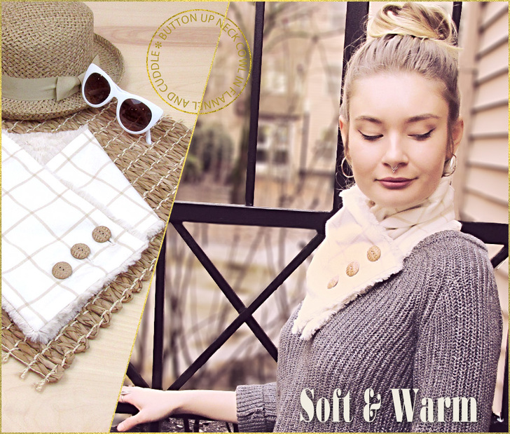 Across the US, winter seems to be hanging on tighter than the waistband of your favorite jeans after a few too many holiday treats! This warm-you-up neck cowl will get you through the wicked weather in style. It’s like a mini scarf that buttons around your neck. Ours is smooth flannel on the outside and soft luxury fleece on the inside. Toasty times two!