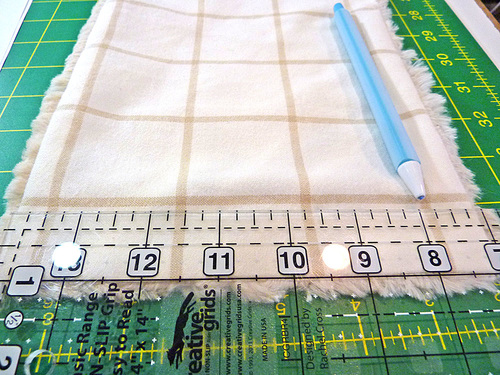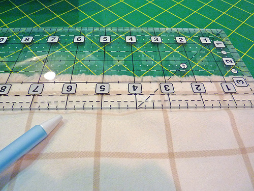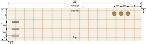 - As shown in the drawing above, mark for the three buttonholes. The center of the first buttonhole is 1” from the top seamed edge and 1” in from the side seamed edge. The second and third buttonholes are evenly space at 1½”, which puts the third buttonhole 3” from the bottom seamed edge.