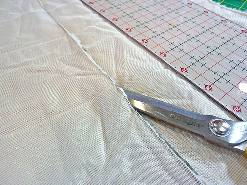 - Cut along the drawn line. When cutting, the idea is to cut only the backing and not the nap of the fleece. Use just the tips of your scissors. With the wrong side facing up, slide the bottom blade of your scissors up next to the backing. Cut with short, deliberate snips, being careful to cut just the backing. If you feel a drag, you’re starting to cut the nap. Back off and start again.