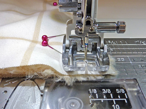 - Pin or clip in place along the raw edges at a right angle, this will allow you to sew right up to the pin before pulling it out. Also, when pinning luxury fleece, remember to tuck its longer nap to the inside as you go so you are less likely to catch up the hairs in the seam (remember to check out our Sewing with Plush Fabrics tutorial for more details and photos).