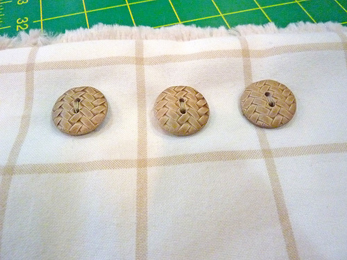 NOTE: The cut is just 8” high, but if your plaid motif is on the larger side, get ⅓ yard in order to allow you to more easily achieve a perfect fussy cut. - THREE ⅞” – 1” buttons; we recommend a two-hole (best) or four-hole button, not a shank button – we used ⅞” buttons, purchased locally
