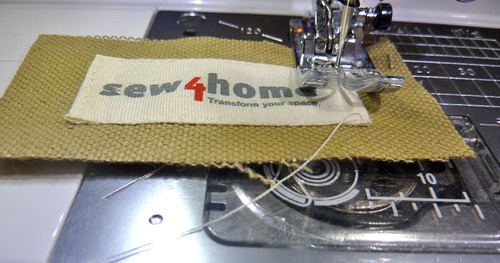 5. Stitch the label rectangle to one of the two plain (no grommet) 10″ x 4¼” accent panels, placing it to match the grommet: centered top to bottom within the panel with the center of the rectangle 3½” from one raw end of the panel. We used a simple decorative stitch in the gray thread we will use for all the topstitching accents.