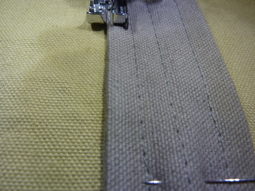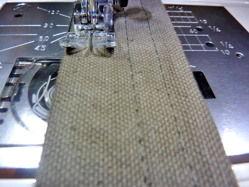 5. With your machine threaded with the topstitching thread in the top and bottom, topstitch down the exact center of each strap, then topstitch ¼” to the left of the center seam and ¼” to the right of the center seam, resulting in three topstitching seams the length of each strap.