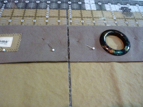 NOTE: Remember that these grommet panels will be opposite one another on the bag, which means (wrap your head around this one!) they are on the same side as you look at the bag. The grommet panel is the right panel on both the front and the back. Then, when you place the completed front and back panels right sides together to sew together, these panels/grommets are now opposite one another. This seems counter-intuitive when you are making the bag, but try it with a couple sheets of paper, it really does work – allowing you to thread the final strap from one side to the other.
