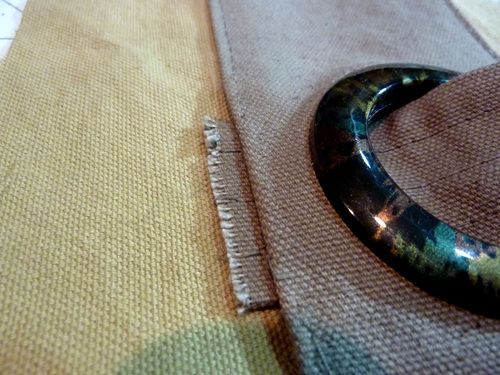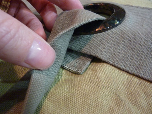 8. Find the front panel and the SHORT handle strap. Slip the raw end of the strap around the top portion of the grommet in the same manner as you attached the strap through the bottom, bringing the raw end up from beneath the folded edge of the panel by about ½”. Again, opening up any basting stitches.