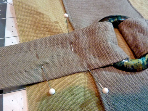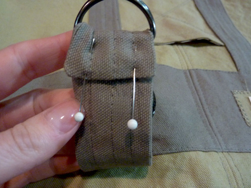 7. Find the two D-rings. Slip the finished end of the short strap through both of the rings. Bring the finished end around to the back of the strap approximately 1″ and pin in place.