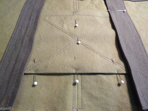 6. Find the two shorter body panel straps. These go below the plain panels. As above, if you machine basted the panels in place, open up a bit of the seam at the center of the panel along the bottom edge. Slip the raw edge of a strap into place under the panel about ½”.