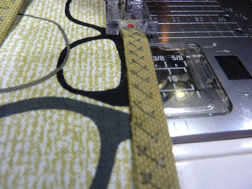 9. Place the straps back into position, covering the raw side edges of the pockets. Pin in place, then topstitch the straps in place along the entire length of the inner edge of each of the four straps, matching the edgestitching you did along the outer edges. This secures the remaining side of each strap as well as both pockets. As above, do not stitch up onto the horizontal panels.