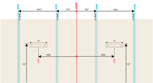- Measure 7⅞” to the right of center and draw a parallel vertical line. From this second line, measure 14¾” to the right and draw another parallel vertical line.