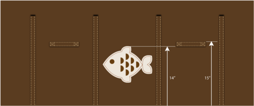 - Find the exterior panel, which should have the casings stitched in place. Place the panel right side up and flat on your work surface. The appliqué design goes on the center front of the hamper, centered between the two casing strips. The top of the Fish Template should be 14” up from the bottom raw edge of the exterior panel. The top of the Seahorse Template should be 15” up from the bottom raw edge of the exterior panel.