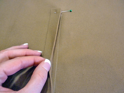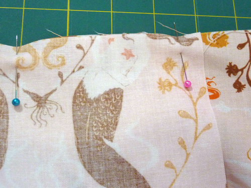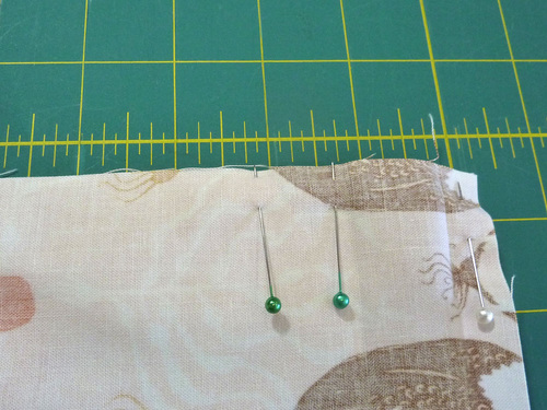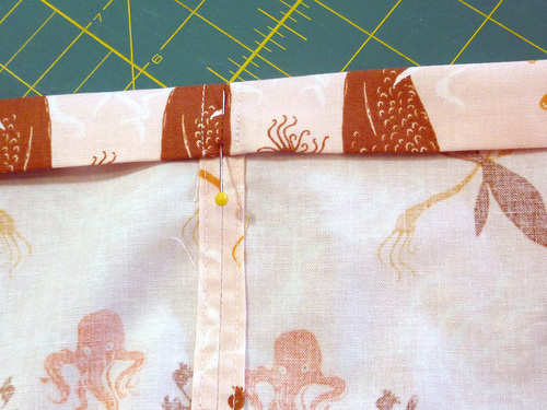 - On the opposite side, you’ll measure to leave an opening at the top for inserting the drawcord. We recommend using different color pins to help cue you to the the opening. We used green.