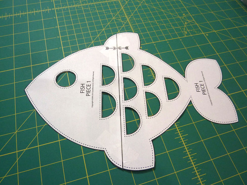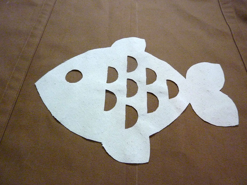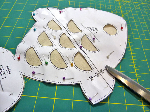- Flip the canvas so it is right side up and position the appliqué template over the fused area. We are showing the Fish Template. Pin in place. Cut out the appliqué template.