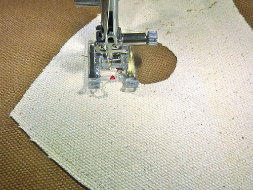 - Re-thread the machine with thread to best match the exterior canvas in the top and bobbin. Re-set the stitch length to normal.