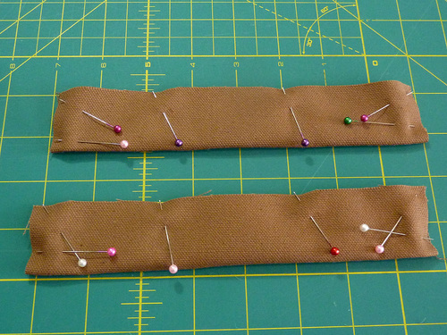 - Find the two 3” x 8” strips. Fold each strip in half lengthwise so it is now 1½” x 8”. Pin all around, leaving an approximate 2” opening for turning at the middle of the 8” side.