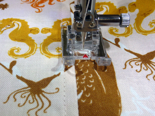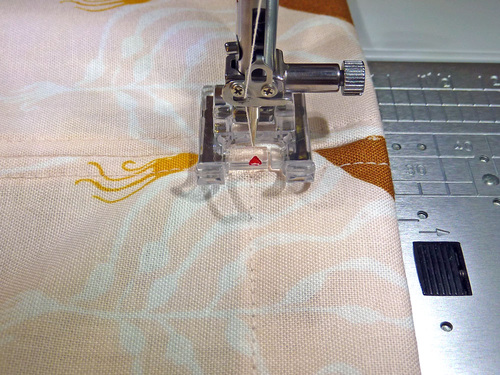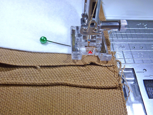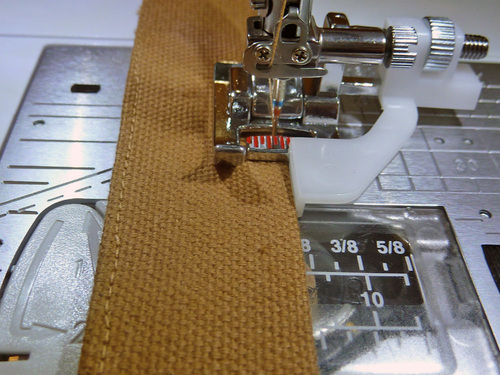 - Lengthen the stitch to match what you used to stitch the casings in place. Edgestitch around all four sides of each handle, pivoting at the corners. We used our Janome Edge Guide foot again.