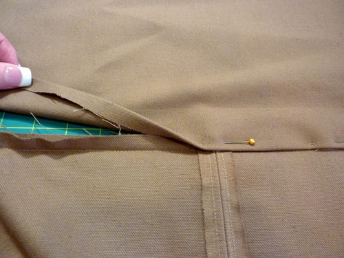 NOTE: Remember, for all kinds of great seam finishing ideas, take a look at our four part series on Machine Sewn Seam Finishes. - Fold the top hem back down into position (½” and then 1”) to create the drawcord channel. Pin in place all around.